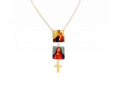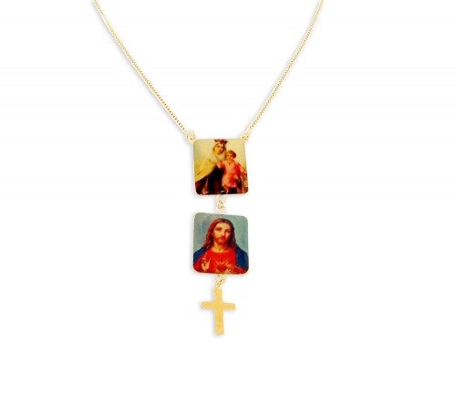 GF0029: 10 x 41 mm - Gargantilha em ouro amarelo 18k, escapulário “Zenilda” retangular em ouro – FULL IMAGE (Nossa Senhora da Penha e Sagrado Coração de Jesus) Modelo: zenilda retangular
