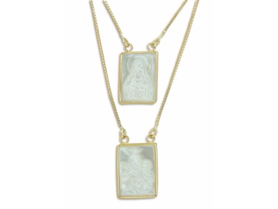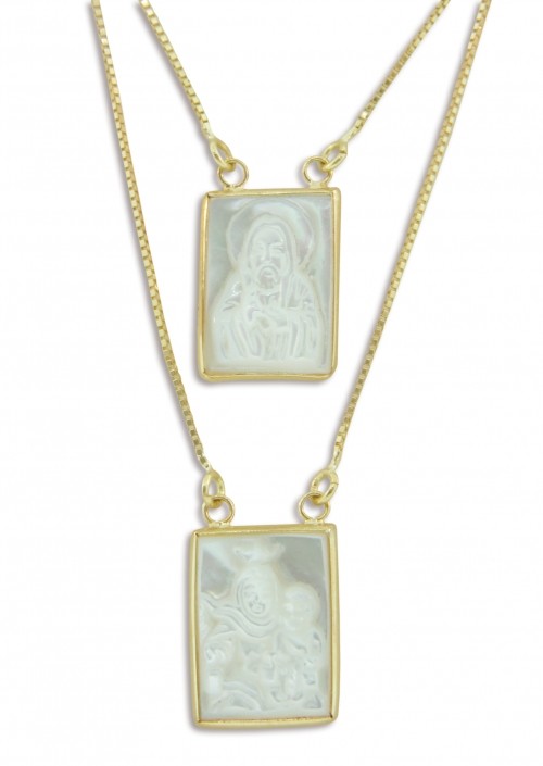 GF0022: 9 x 12 mm - Gargantilha em ouro amarelo 18k, escapulário na madre pérola em baguete pequena, com contorno em ouro e imagem (Nossa Senhora da Penha e Sagrado Coração de Jesus)