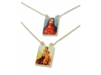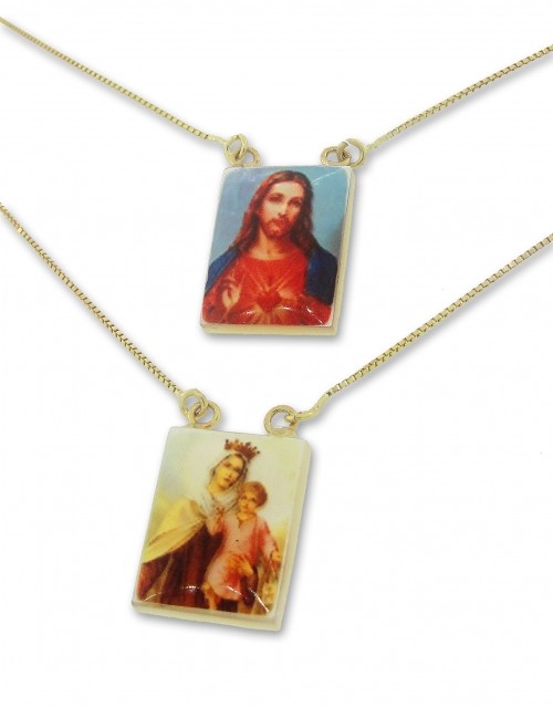 GF0053: 10 x 13 mm - Gargantilha em ouro amarelo 18k, escapulário em madre pérola – FULL IMAGE (Nossa Senhora da Penha e Sagrado Coração de Jesus)