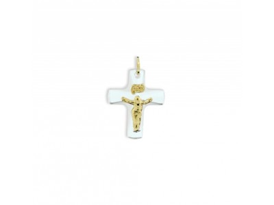 PF0012: 9 x 12 mm - Pingente em ouro amarelo 18k, com cruz em cristal e cristo em ouro Opção: ouro branco, ouro amarelo.