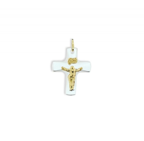 PF0003: 15 x 19 mm - Pingente em ouro amarelo 18k, com cruz em cristal e cristo em ouro Opção: ouro branco, ouro amarelo.