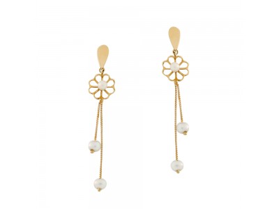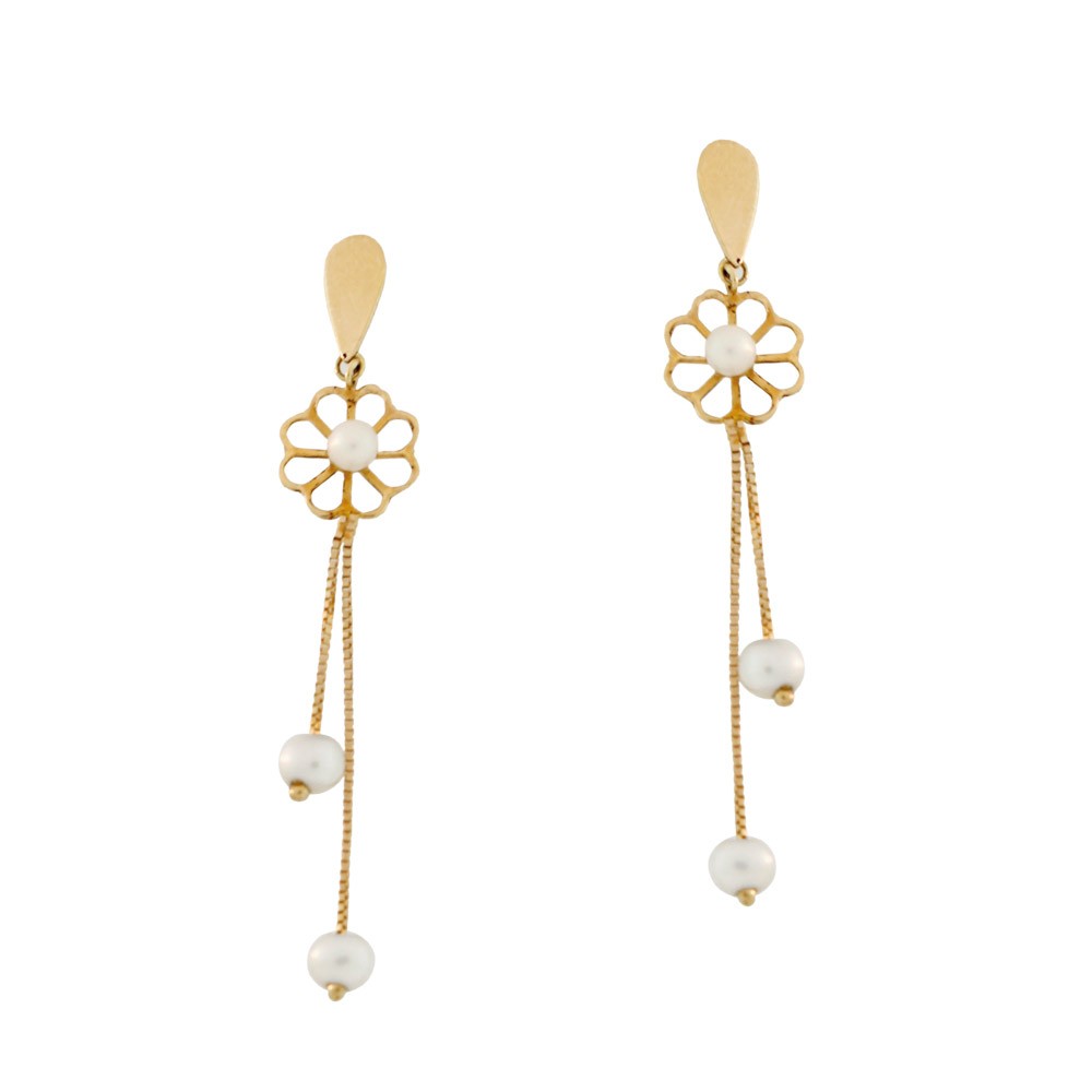 - Brinco em ouro amarelo 18k, com chapa em ouro, flor vazada, veneziana e perola