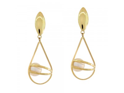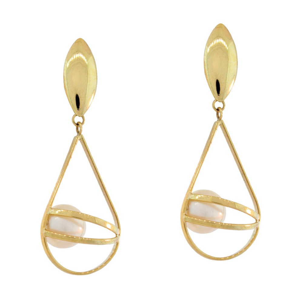 - Brinco em ouro amarelo 18k, com chapa em navete, detalhes em ouro e perola